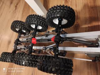 Zadowolony jestem ze skrętu. 3osie połączone drążkami i 2serwa współpracujące dające razem 70kg udźwigu Smile