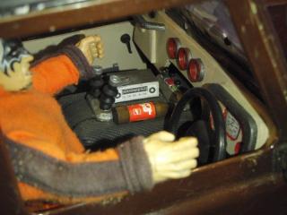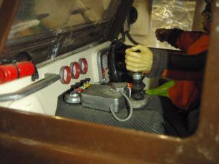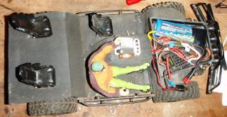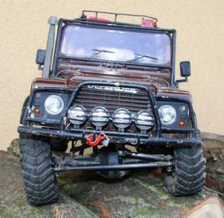 Nadwozie zakupiłem już pomalowane i z wyposażeniem zewnętrznym. Brakowało tylko środka. Postanowiłem więc pobawić się materiałem HIPS i samemu wykonać wnętrzne. Podejrzałem pracę innych kolegów i rozpocząłem modelowanie deski rozdzielczej. Zegary wydrukowałem, a dźwignię zmiany biegów, cb-radio, przełączniki wykonałem według własnej fantazji. Do tego zrobiłem boczki drzwi wyposażone w kieszeń oraz korbkę i klamkę. Zdecydowałem się pomalować deskę w kolorze imitującym skórę zaś dodatki w kolorze stali. W środku rzuca się w oczy duża osłona, która starałem się zatuszować detalami – myśle, że nie wygląda źle. Pod osłoną znajduje się silnik z przekładnią. Udało mi się wygospodarować pod maską miejsce na koszyczek, w którym znalazł się akumulator, regulator i odbiornik. Takie umiejscowienie elektroniki daje możliwość bezpiecznego wjazdu do wody na poziomie całych kół, co dla mnie jest zupełnie wystarczające. Rama podwozia to jak zwykle konstrukcja własna, amortyzatory użyłem z wewnętrzną sprężyną – prezentują się bardzo ładnie. Jako przekładnia po raz kolejny użyłem traxxas 1:16 z flanszą do silnika wielkości 540. Z tyłu pod podwoziem wygospodarowałem miejsce na serwo, które służy, jako wyciągarka. Lina wyciągarki jest poprowadzona wewnątrz mosiężnej rurki do przodu pojazdu pod zderzak.  Zderzak, jak również progi, wykonałem ponownie z rurek mosiężnych lutowanych ręcznie i pomalowałem farbą typu hammerite na półmat czarny. Wały napędowe zaadoptowałem z modelu Traxxas. Mosty to obecnie Axial. Zastanawiałem się długo, czym pomalować podwozie. Do tej pory stosowałem farby zwykłe, antykorozyjne, ale wszystkie one zdzierały się pod wpływem terenu. Wiem oczywiście, że  jakakolwiek farba trudno trzyma się aluminium, ale tym razem użyłem farby chlorokauczowej. Tak zbudowany model przeszedł pierwsze testy w terenie i jestem z niego bardzo zadowolony. Obecnie startuję tym modelem w zawodach ogólnopolskich i cały układ napędowy świetnie się sprawdza. Ponieważ gięcie i lutowanie rurek idzie mi coraz lepiej postanowiłem wykonać klatkę na nadwozie. Zadanie ambitne i skomplikowane, ale się udało. Dodatkowo na zderzak zostały zamontowane halogeny.