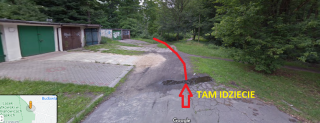 Parking przy ul. Leśnej obok garaży, za ostatnim garażem lekko w lewo na polane gdzie znajduje się altana i idziemy dalej prosto w stronę drewnianego podestu na balach za nim lekko w lewo i prosto ok30m i jesteście na miejscu