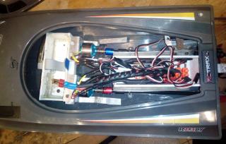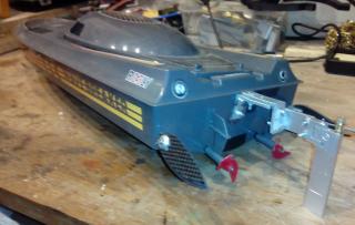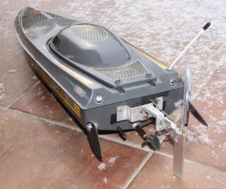 Pierwotnie po zakupie była to motorówka napędzana dwoma silnikami szczotkowymi klasy 360, które służą również do skrętu. Wcale źle nie pływała, nawet mi się podobało. Po pewnym czasie gdzieś przypadkiem wpadł mi w oko tekst, że profesjonalna motorówka to ma mieć jeden silnik i ster. Pomyślałem wiec, że wstyd mieć dwa silniki, bo to przecież tylko zabawka. Zebrałem się w sobie i zrobiłem zakupy części w pewnym azjatyckim sklepie. Kupiłem wał napędowy w obudowie, większą śrubę, ster z odprowadzeniem wody, aluminiową rurkę, którą owija się wokoło silnika, przewód silikonowy, Dwa stabilizatory z włókna węglowego, wyjście dla wody chłodzącej i rozpocząłem przebudowę. Na próbę zamontowałem silnik szczotkowy 19T – pomyślałem, że jeśli wszystko będzie super to zamontuję bezszczotkę z płaszczem wodnym. Do tego mój wodoodporny regulator HPI CS-15WP (notabene jest on faktycznie wodoodporny i pełne zanurzenie mu nie szkodzi – sprawdziłem). Zdemontowałem dwa silniki, podziurawiłem kadłub i zamontowałem mój nowy osprzęt. Pierwsze wodowanie – oj cieknie – ale spróbujmy. Pływa nieźle, jednak okazało się, że motorówka skręca słabo skręca i to tylko przy większej prędkości. Do tego mój system zaciągania wody do chłodzenia silnika też nie działa. Teoretycznie polega to na tym, że w sterze są małe otworki, przez które woda dostaje się w wydrążeniach do góry steru, po czym ma płynąć rurką do rurki aluminiowej owiniętej wokoło silnika i go chłodzić a następnie wylewać się z boku przez odpływ. Teoretycznie tak powinno działać, a nie działa. Nie potrafi zaciągnąć wody. Przez te problemy motorówka wylądowała na półce na jakiś rok.