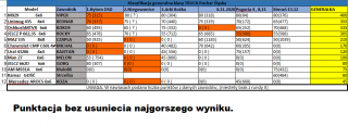 Chłopaki zobaczcie jak zmienia sie lokata czy miejsce w momencie usuniecia 1 najgorszego wyniku w stosunku do osob które były na wszystkich zawodach. Osoba która byla na wszystkich zawodach i usunieto jej najgorszy wynik moze spasc o 1 lub kilka pozycji w klasyfikacji generalnej co obrazuje moja osoba. w zalaczeniu pliki pogladowe.