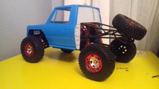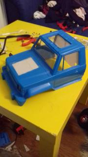 Po wielu przymiarkach stanęło na budę od wadera ale na pajero I. Głównym powodem jest to że ten model w oryginale ma z przodu wahacze, a Toyota nie. Oczywiście w pierwszej kolejności zniknął z maski ten paskudny "big block", oraz pojawiły się szyby. Wszelkie próby zakończyły się wersją zabudowy typu truggy. Następnie musiałem, wyciąć nadkola i zderzak, żeby chociaż w niewielkim stopniu przednie zawieszenie mogło pracować. W ostatnim etapie na pokładzie zawitało oświetlenie. Do zrobienia został mi przedni zderzak oraz jakiekolwiek wnętrze z kierownikiem. Na koniec zostanie dociążenie kół, ponieważ już teraz, pomimo szerokiego rozstawu kół model zrobił się dość wywrotny.