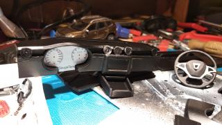 Dacia jest obecnie na etapie: biały montaż, ale najpierw malowanie karoserii. Ogólnie podwozie jeździ przód i tył, skręca. Dość twarde, ale małe amortyzatory dają znikomy wykrzyż, jak w prawdziwej Dacii