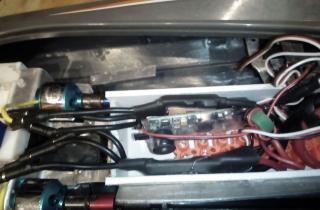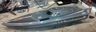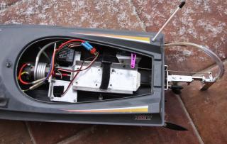 Pierwotnie po zakupie była to motorówka napędzana dwoma silnikami szczotkowymi klasy 360, które służą również do skrętu. Wcale źle nie pływała, nawet mi się podobało. Po pewnym czasie gdzieś przypadkiem wpadł mi w oko tekst, że profesjonalna motorówka to ma mieć jeden silnik i ster. Pomyślałem wiec, że wstyd mieć dwa silniki, bo to przecież tylko zabawka. Zebrałem się w sobie i zrobiłem zakupy części w pewnym azjatyckim sklepie. Kupiłem wał napędowy w obudowie, większą śrubę, ster z odprowadzeniem wody, aluminiową rurkę, którą owija się wokoło silnika, przewód silikonowy, Dwa stabilizatory z włókna węglowego, wyjście dla wody chłodzącej i rozpocząłem przebudowę. Na próbę zamontowałem silnik szczotkowy 19T – pomyślałem, że jeśli wszystko będzie super to zamontuję bezszczotkę z płaszczem wodnym. Do tego mój wodoodporny regulator HPI CS-15WP (notabene jest on faktycznie wodoodporny i pełne zanurzenie mu nie szkodzi – sprawdziłem). Zdemontowałem dwa silniki, podziurawiłem kadłub i zamontowałem mój nowy osprzęt. Pierwsze wodowanie – oj cieknie – ale spróbujmy. Pływa nieźle, jednak okazało się, że motorówka skręca słabo skręca i to tylko przy większej prędkości. Do tego mój system zaciągania wody do chłodzenia silnika też nie działa. Teoretycznie polega to na tym, że w sterze są małe otworki, przez które woda dostaje się w wydrążeniach do góry steru, po czym ma płynąć rurką do rurki aluminiowej owiniętej wokoło silnika i go chłodzić a następnie wylewać się z boku przez odpływ. Teoretycznie tak powinno działać, a nie działa. Nie potrafi zaciągnąć wody. Przez te problemy motorówka wylądowała na półce na jakiś rok.